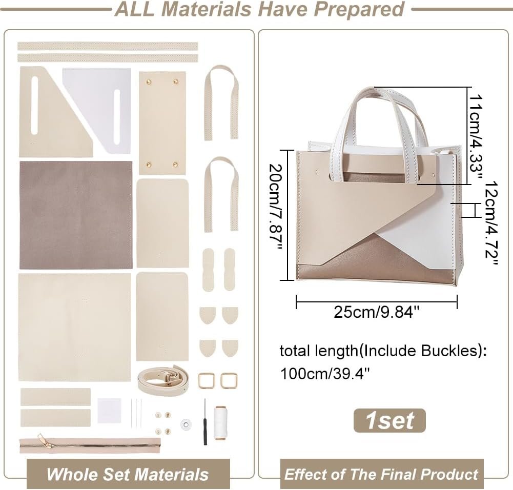 You will receive 1 set DIY leather handbag sewing kit including PU leather sewing materials, imitation leather strip and shoulder straps, thread, zipper, metal loops, snap buckle, needle, screws and screwdrivers. Perfect for everyone to make their own DIY tote bag.